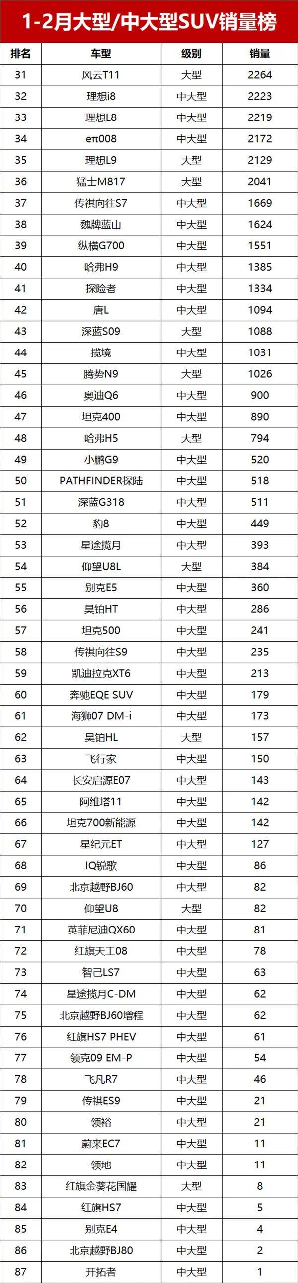 总体来看,2026年1-2月大型和中大型SUV市场呈现出“新能源独大、燃油车坚守”的格局,国产新能源车型全面崛起,不仅包揽榜单头部位置,还凭借高性价比和丰富配置,不断挤压合资燃油车和豪华品牌的市场空间。随着车型迭代加快和消费需求升级,大型和中大型SUV市场的竞争还将进一步加剧,后续能否持续保持逆势增长,值得我们持续关注。