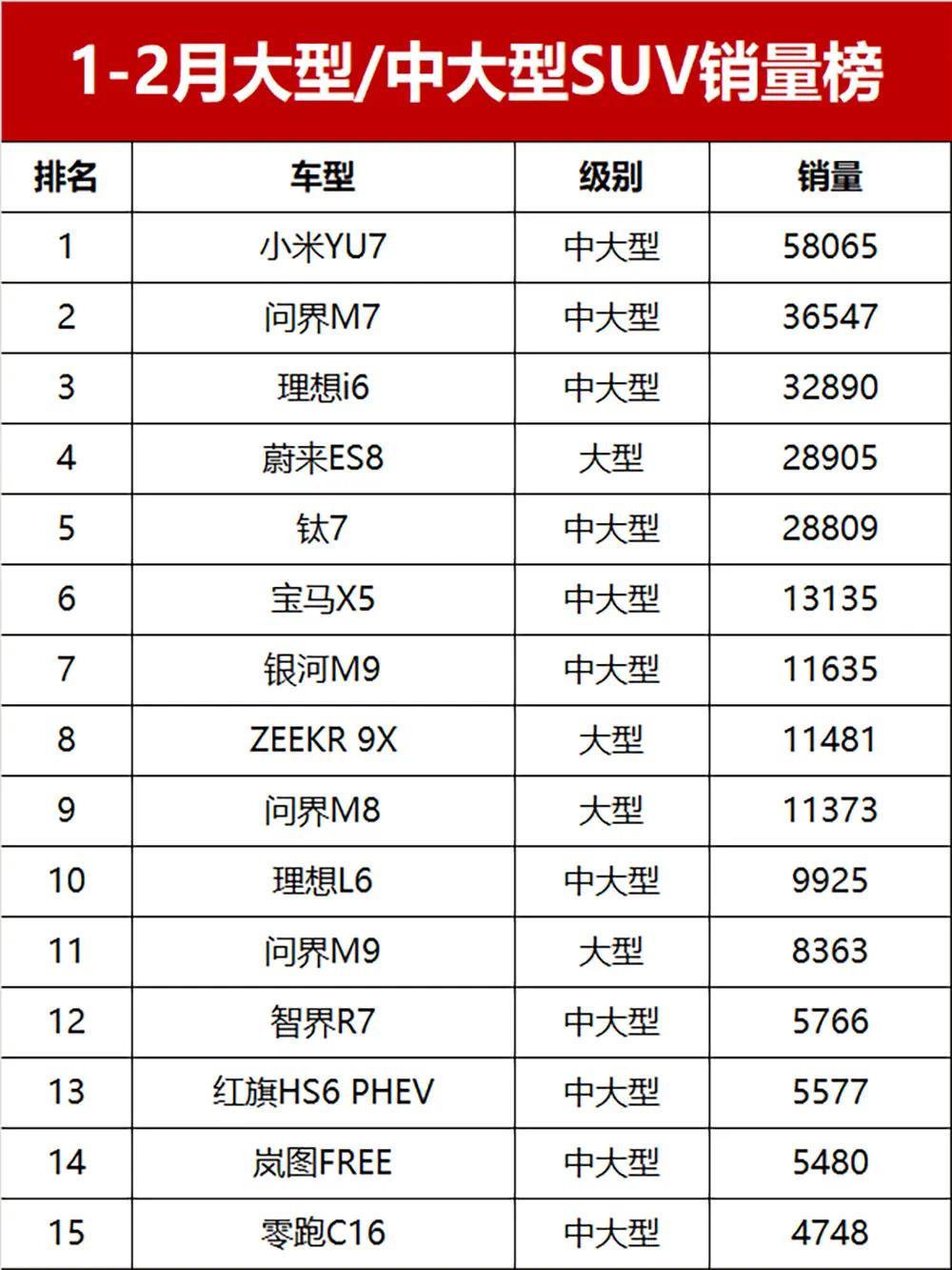 具体来看,前两个月大型和中大型SUV市场彻底被新能源车承包,头部车型表现堪称“炸裂”。小米YU7直接断层领跑,以58065辆的累计销量稳坐冠军宝座,比第二名多出2万多辆;紧随其后的问界M7,以36547辆的销量排名第二,销量表现依旧稳健。