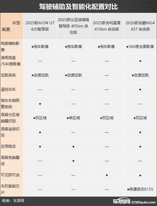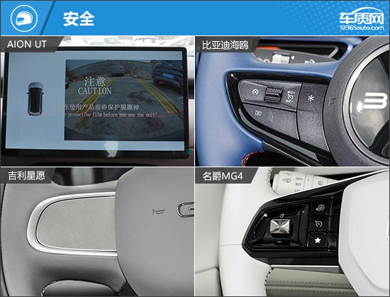 驾驶辅助配置方面,名爵MG4在驾驶硬件方面表现更好,在四款车型中独享360度全景影像和透明底盘/540度影像,更方便驾驶者了解车辆周围情况。驾驶功能方面,名爵MG4独享遥控泊车,面对狭小车位时会更从容;AION UT独享的倒车车侧预警系统可以提升日常泊车的安全性。相比之下,吉利星愿在这一环节表现不佳,甚至连最基础的定速巡航都没有配备。