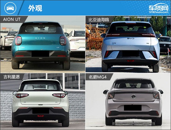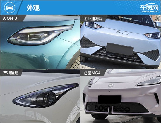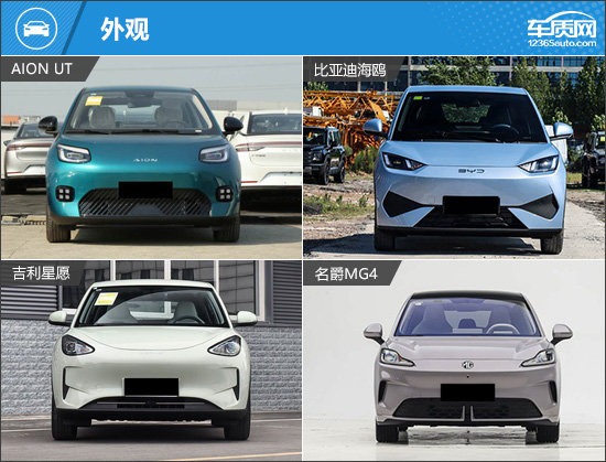 外观设计方面,AION UT采用最新家族式设计风格,视觉效果精致小巧且科技感十足。前脸睡眼惺忪的“萌鸟大眼”LED大灯拥有很高的辨识度,前包围两侧的2X2矩阵式LED雾灯可以进一步提升照明效果。比亚迪海鸥基于海洋美学设计打造,前脸造型棱角分明,线条犀利简洁,与同级别车型常见的圆润设计有明显不同。吉利星愿整车采用大量圆润线条,营造出可爱的视觉效果。前脸应用了封闭式前格栅,三角形大灯组看上去非常呆萌,很容易讨好年轻女性消费者。作为一款全球车型,名爵MG4由原布加迪威龙设计师约瑟夫卡班操刀,延续MG Cyberster的跑车基因。“猎鲨”前脸设计勾勒出强烈的攻击性,两侧导流槽的加入则进一步强化了运动感。