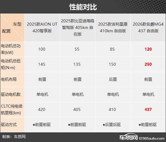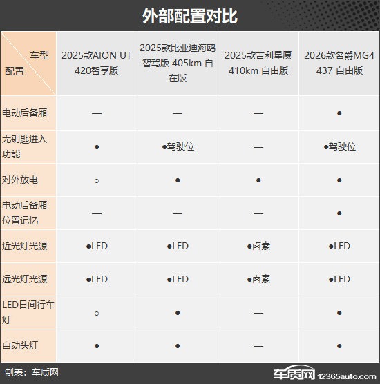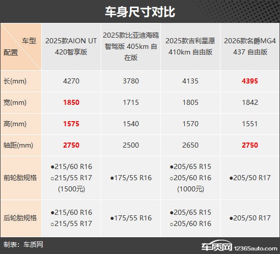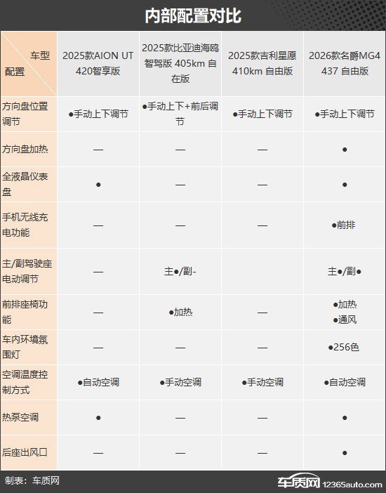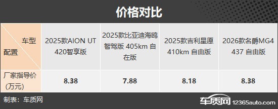 本次挑选的四款车型分别为2025款AION UT 420智享版(以下称:AION UT)、2025款比亚迪海鸥智驾版 405km 自在版(以下称:比亚迪海鸥)、2025款吉利星愿 410km 自由版(以下称:吉利星愿)和2026款名爵MG4 437 自由版(以下称:名爵MG4)。价格方面,四款车型比较接近,价格最高的车型与价格最低的车型,也仅相差5000元(由于目前图片数量较少,因此部分车型的图片并不是相对应的具体款型)。