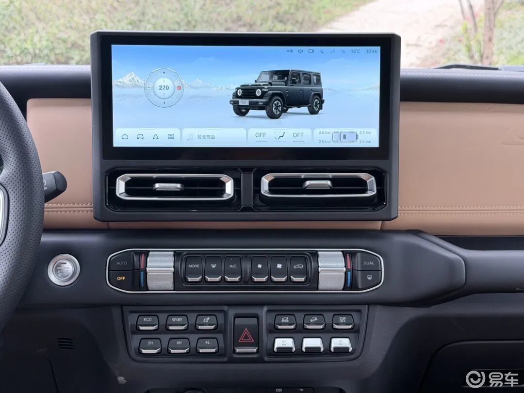 来到车内,专属内饰根据 “高地纹”设计,运用硬朗的军工风格线条与金线勾勒,搭配大量的柔软材料包裹以及黑黄撞色设计,再次强化了车内的力量感与精致度,中控台延续“T”字形经典设计,并保留大量实体按键,在极限驾驶时更便于操作,而更贴合人体工学设计的座椅搭配高坐姿车身设计,不仅乘坐舒适性更强,也为用户带来更开阔视野,以便于更好预判周围路况 。