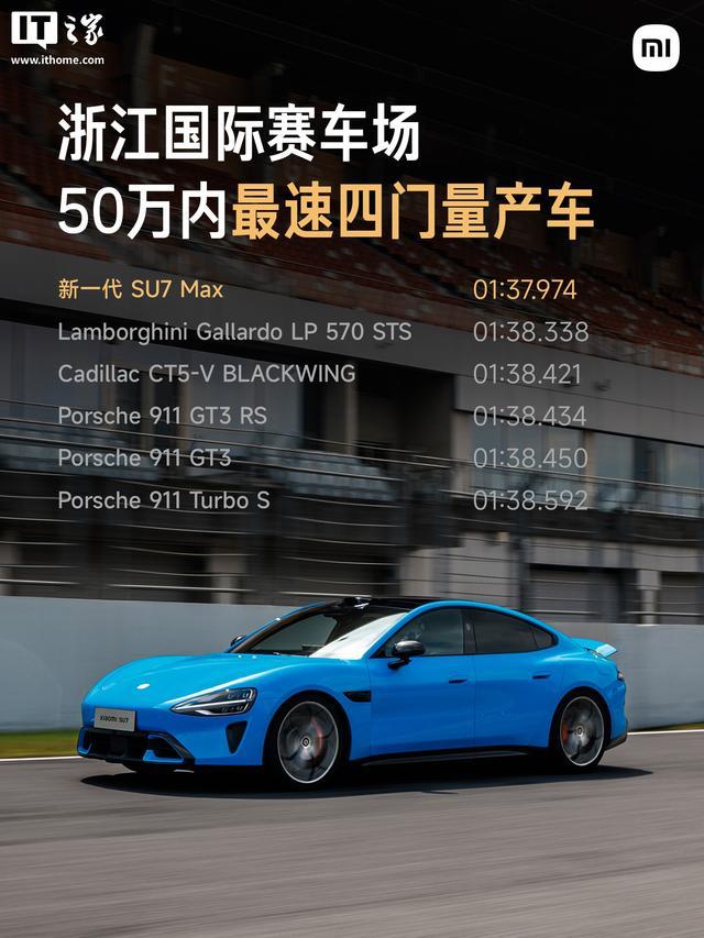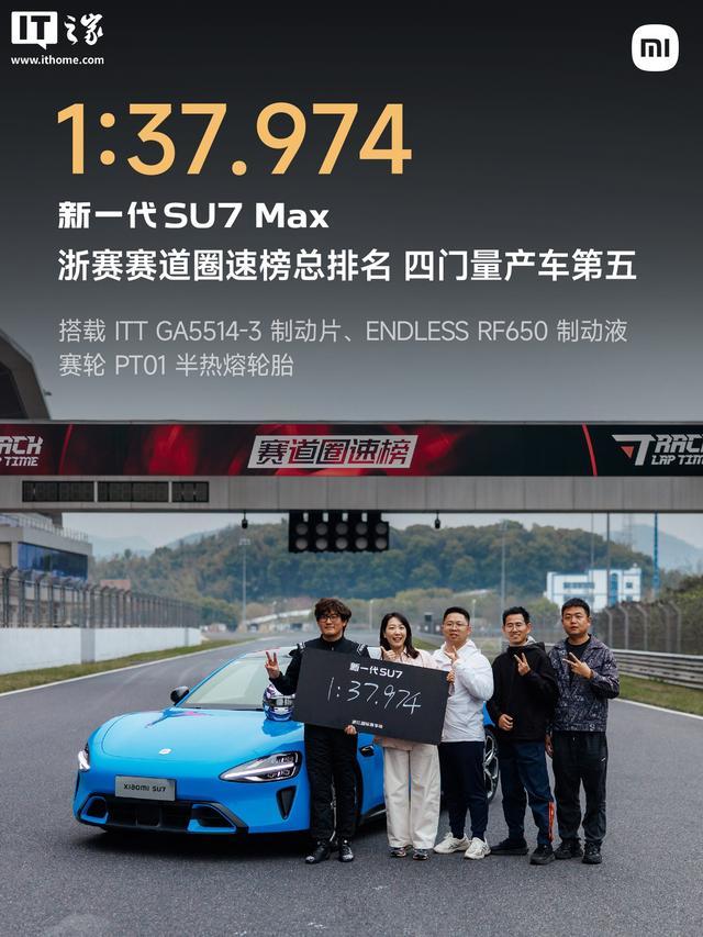 据介绍,新一代 SU7 Max 在浙赛跑出 1:37.974 的成绩,成为浙赛 50 万内最速四门量产车,车手为赛车手罗开罗。此次比赛中,新一代 SU7 Max 还搭载了 ITT GA5514-3 制动片、ENDLESS RF650 制动液以及赛轮 PT01 半热熔轮胎。